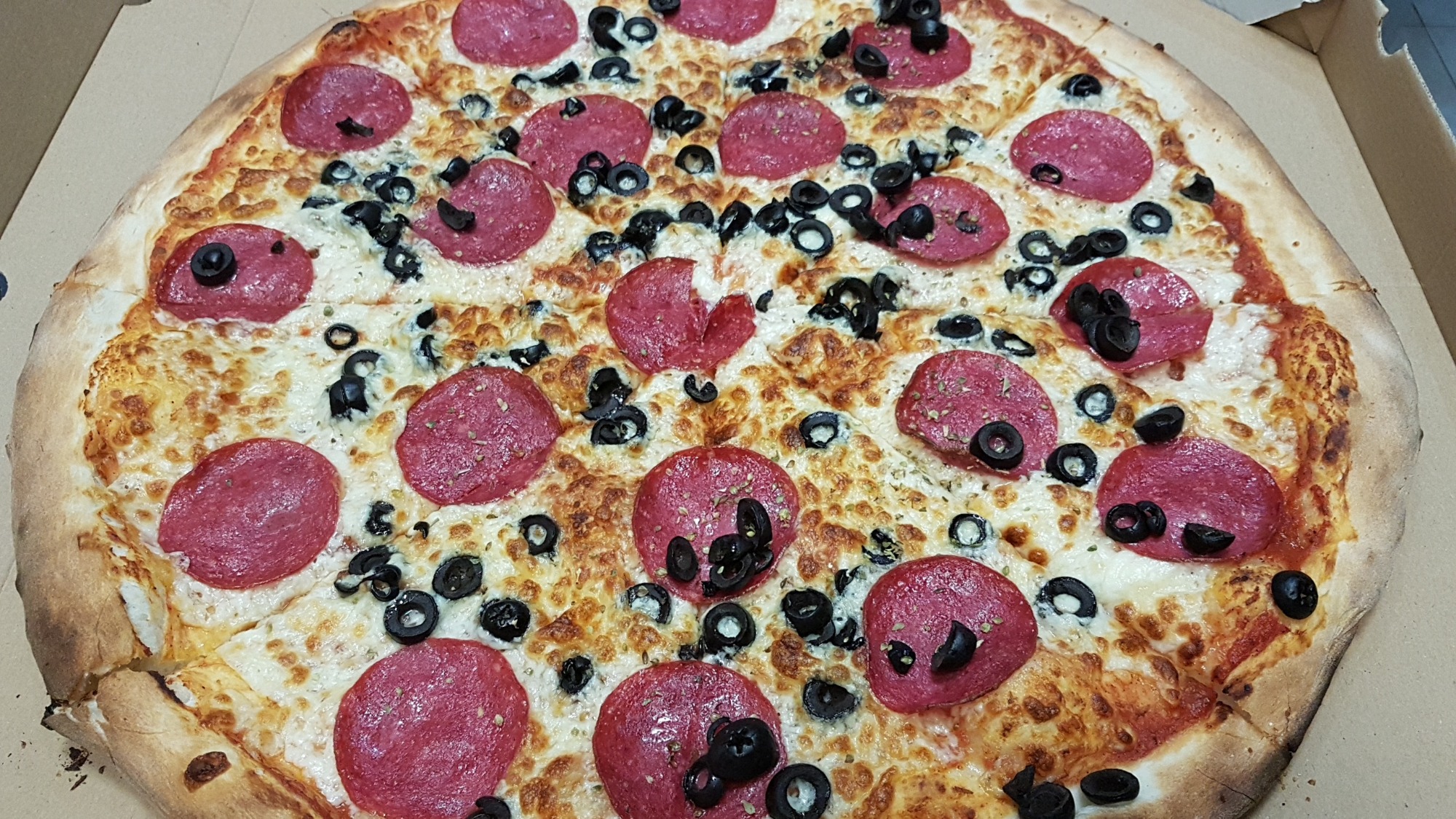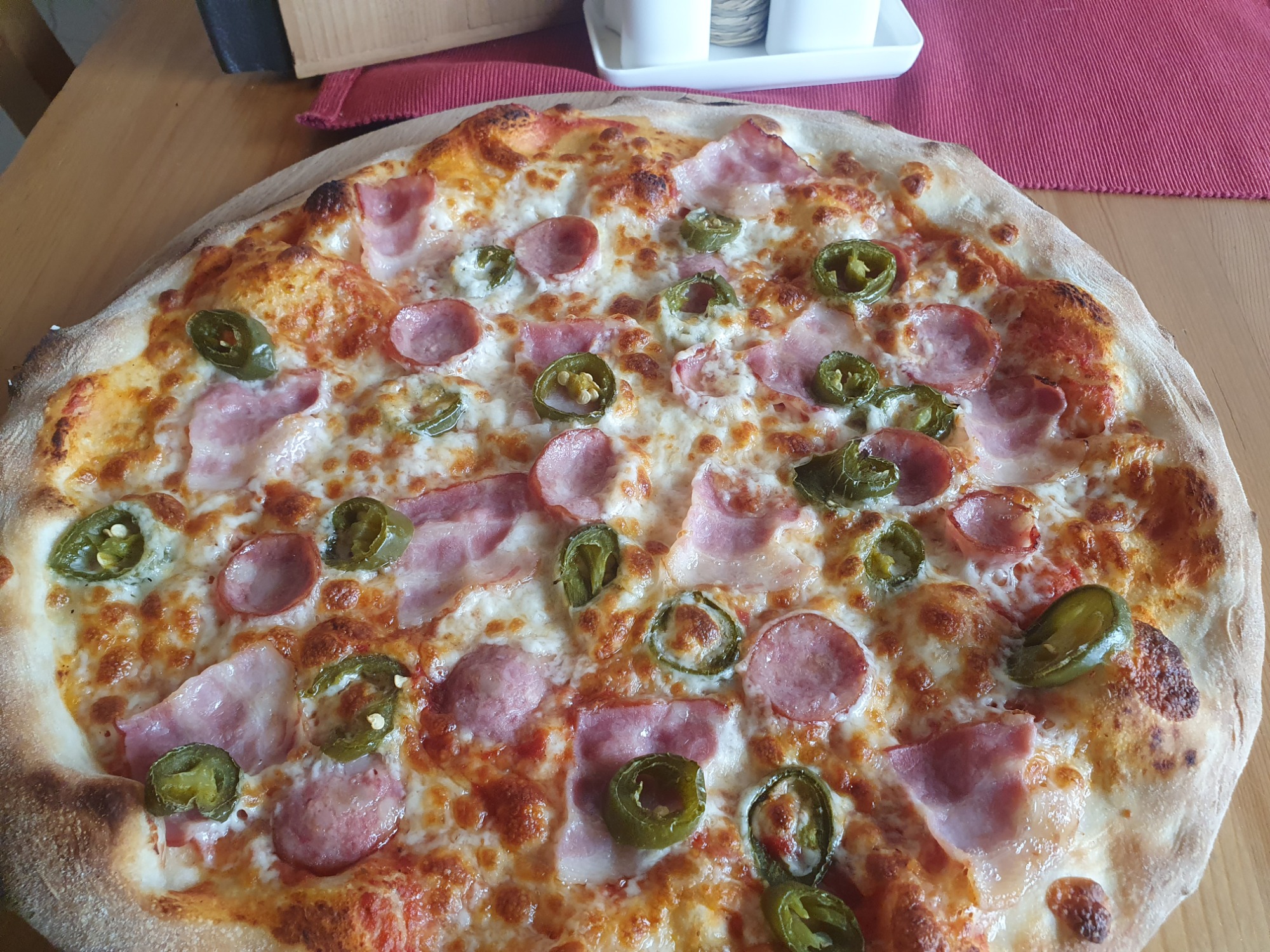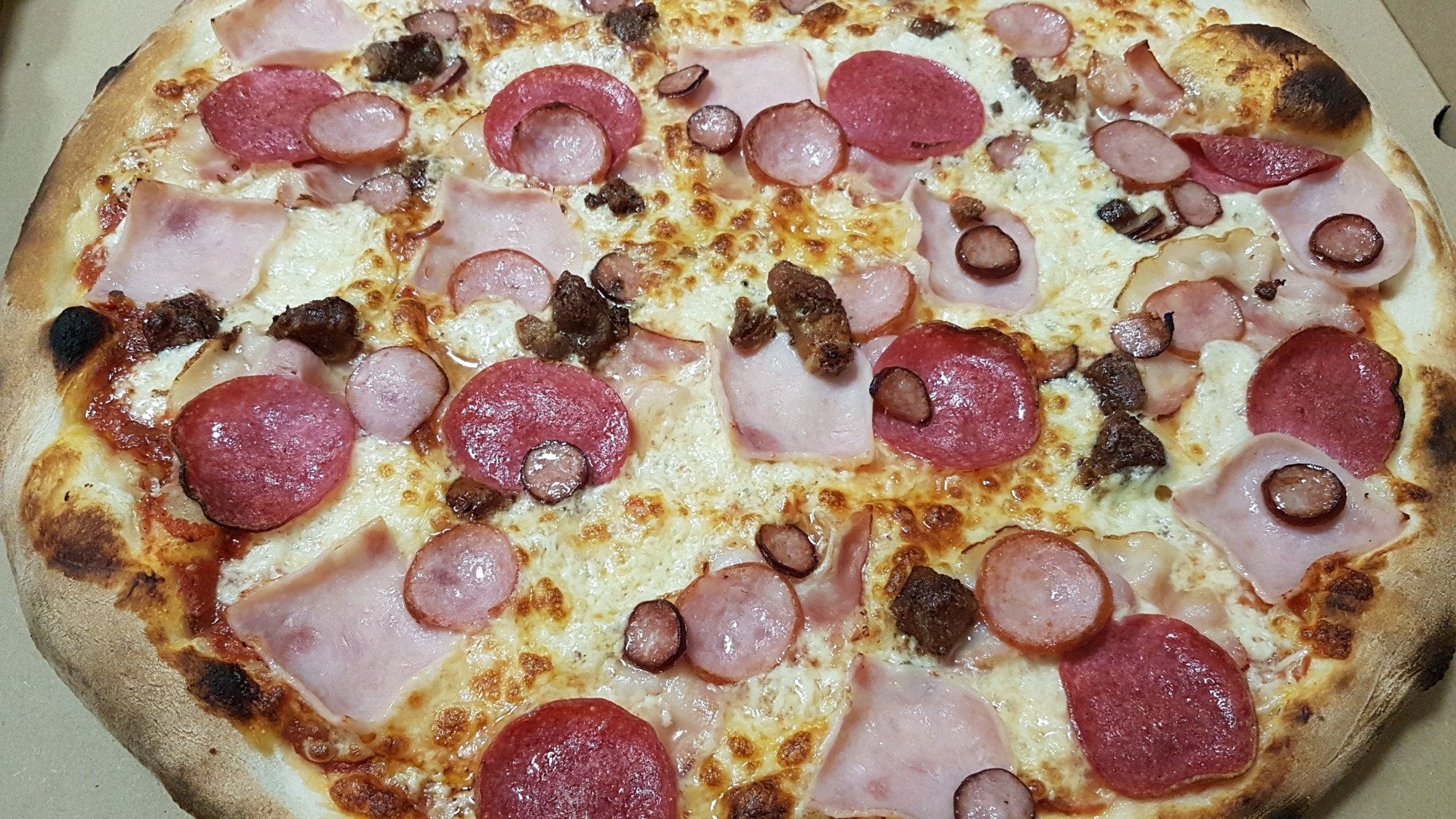 sos pomidorowy, ser, kabanos, ogórek kiszony, oreganoPizza Farmerska
